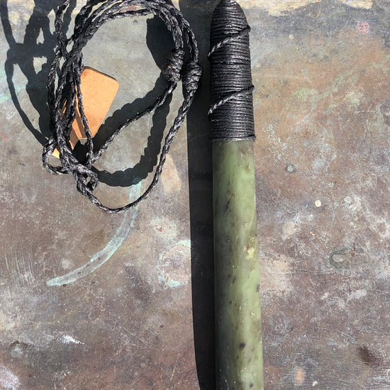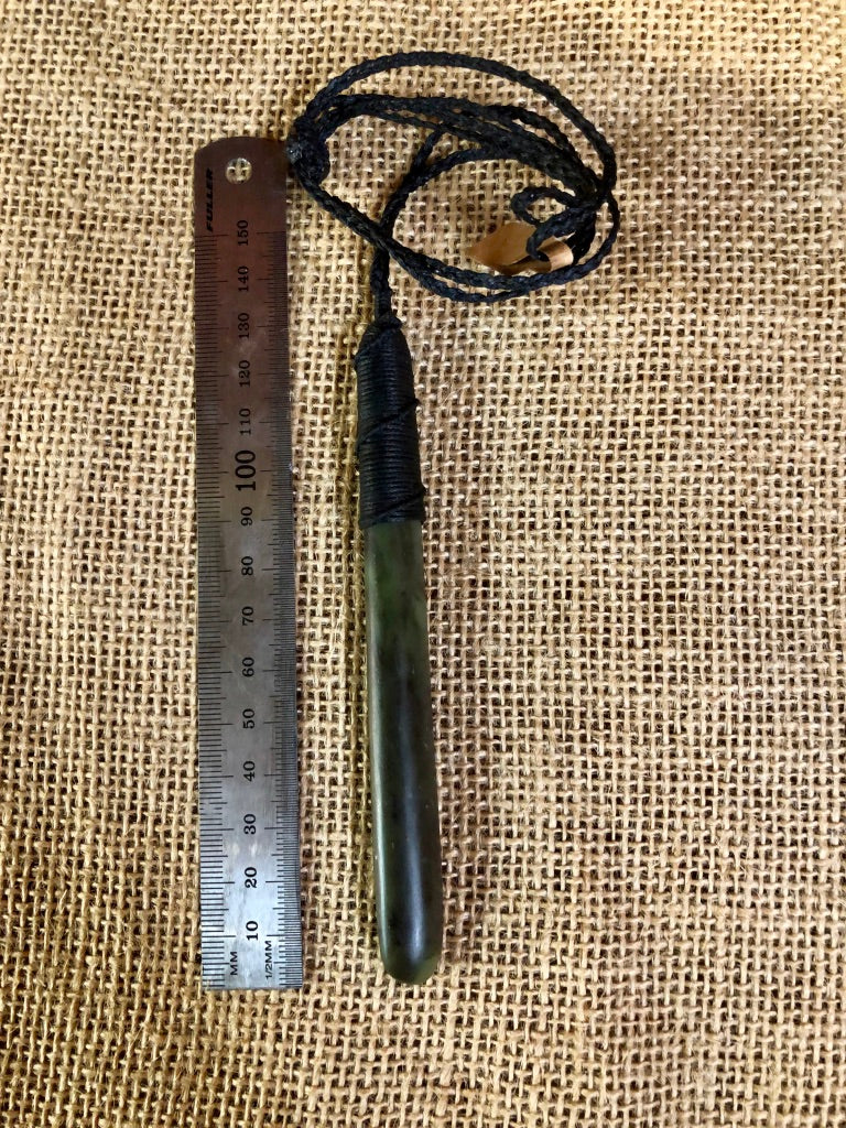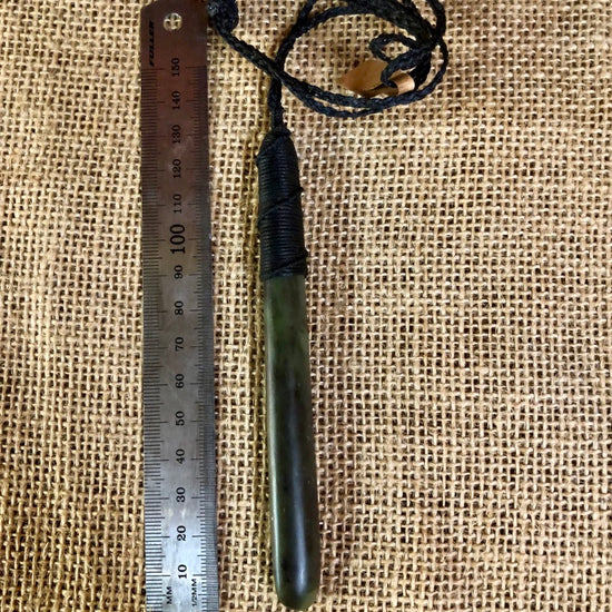 This lovely Olive Green Roimata drop is a statement piece at 130mm in length spiral bound in classic black with a hand plaited fully adjustable cord.